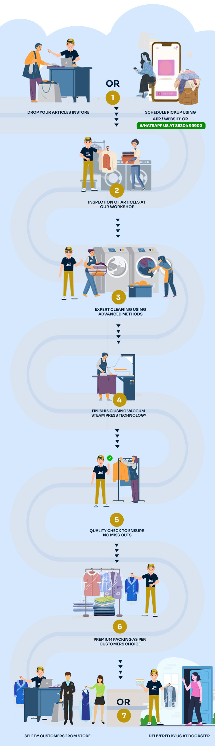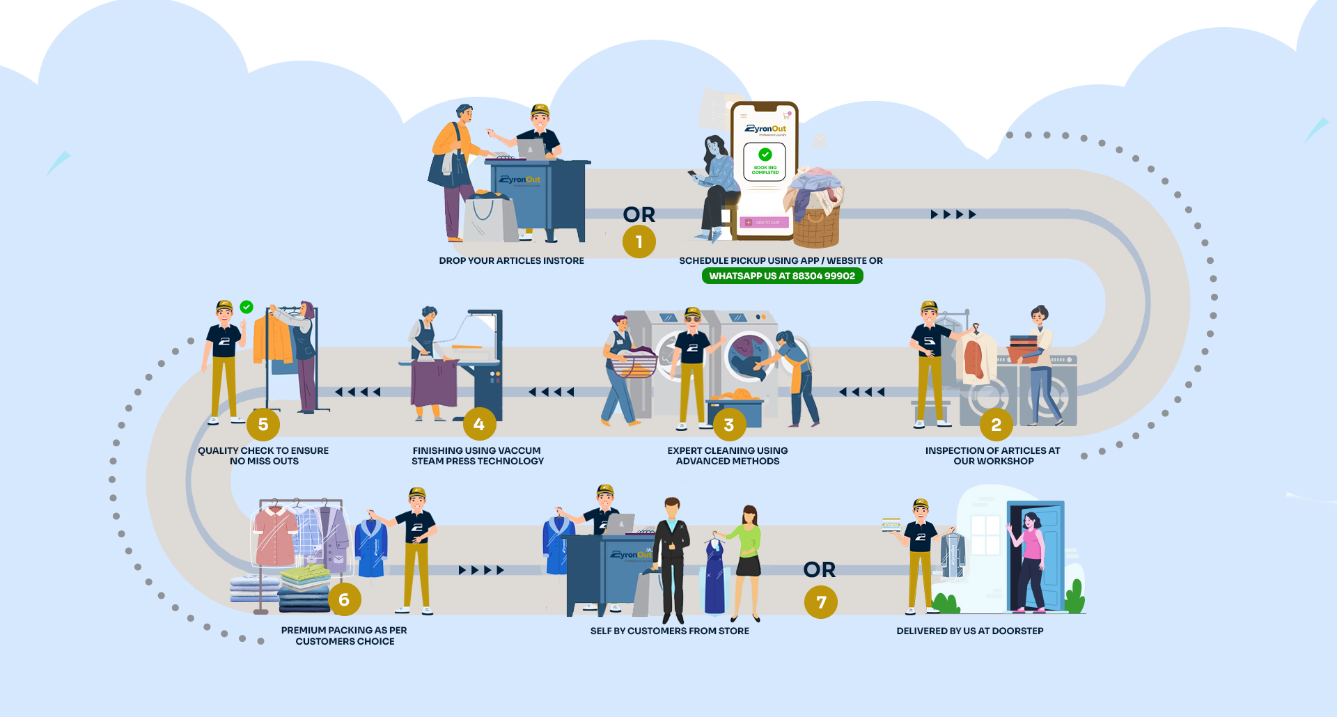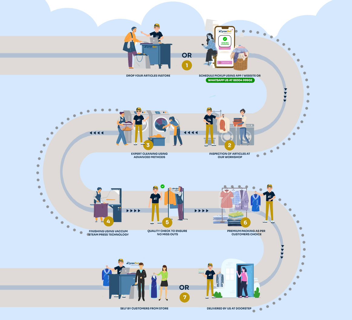 We determine the best cleaning methods which include Washing / Wet Cleaning / Dry Cleaning methods depending upon the type of article. All garments are accepted at Customer’s risk and ZyronOut will not be responsible for fastness / running / bleeding of colour / shrinkage / damage to embellishments / embroidery work, discoloration, trimming, or any other damage on the garments during the process. Every effort is made to remove stains, but we do not guarantee the same and will not be responsible if the stains cannot be removed. We shall not be held responsible for any ornaments/ jewellery fittings on the garment.